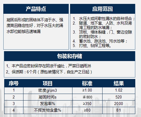 由多異氰酸酯和聚醚多元醇等 原料制成的一種高膨脹型建筑防水補(bǔ)強(qiáng)材料。該產(chǎn)品與水作用后能在數(shù)分鐘內(nèi)體積膨脹至幾十倍,凝固后形成的固結(jié)體不溶水、 強(qiáng)度高且穩(wěn)定好,對(duì)于水壓大的涌水部位能夠迅速堵漏,長(zhǎng)久防水。該產(chǎn)品自身也能吸收空氣中的微量水分子發(fā)生同等化學(xué)反 應(yīng),對(duì)于較干燥的縫隙也能起到很好的填充密封作用,達(dá)到有效 和完美的防水效果。