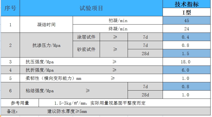 該產(chǎn)品技術(shù)指標(biāo)執(zhí)行國(guó)家行業(yè)標(biāo)準(zhǔn):聚合物水泥防水砂漿GC/T984-2011。